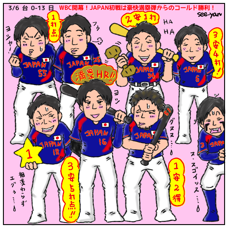 投稿日: 2026年3月7日2026年3月7日2026 WBC 侍ジャパン 絵日記 3/6 遂にWBC開幕!!侍ジャパン初戦快勝スタート!!ヽ(´∀`)ノいきなりの満塁オオタニサーーーーン!このまま1次ラウンド突破目指して頑張れニッポン!!